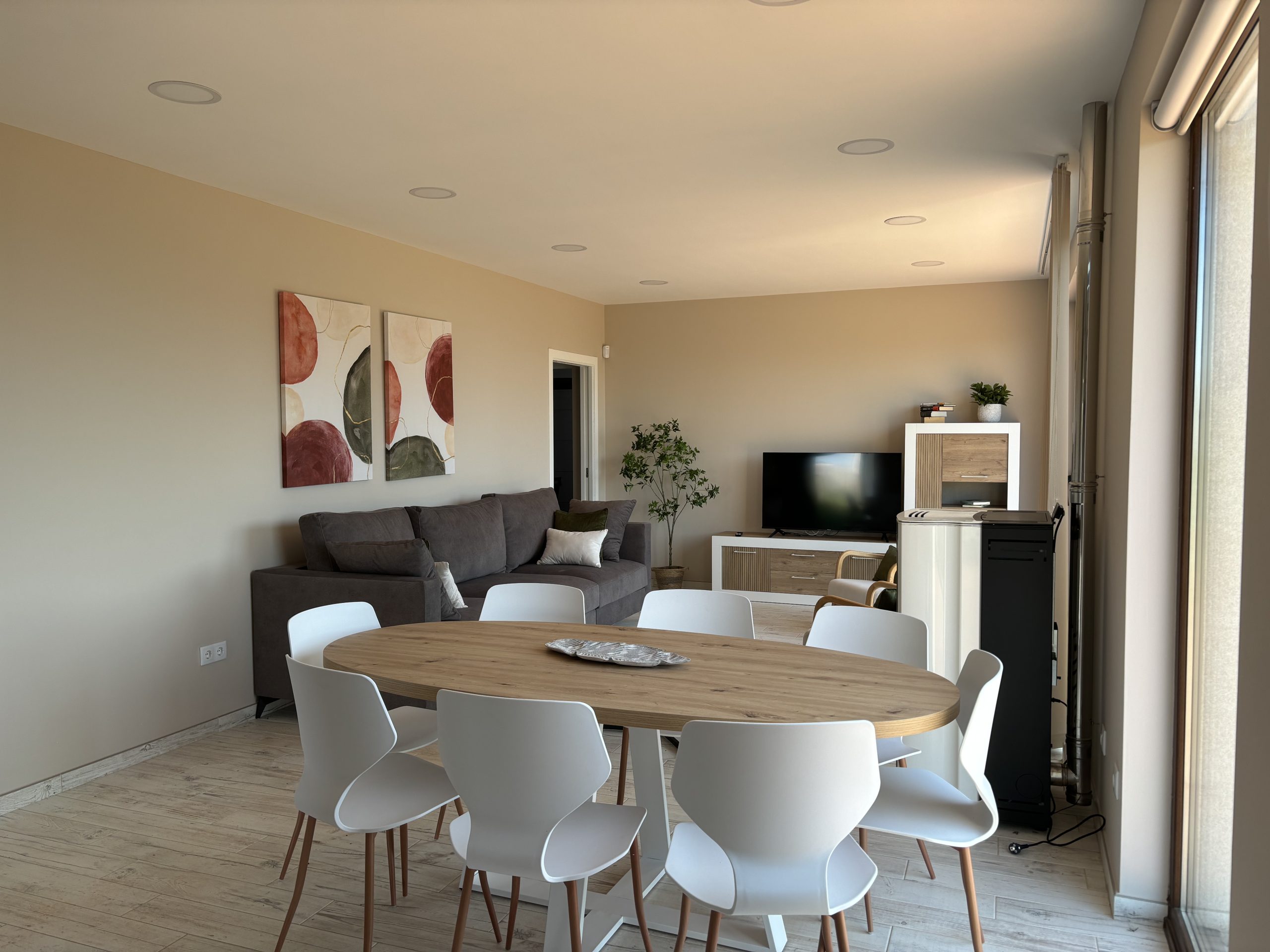 La casa está compuesta por cocina americana con salón-comedor, tres dormitorios con cama doble, sofá-cama, tres baños, terraza, porche, garaje y amplio jardín. Capacidad para un total de 8 personas.